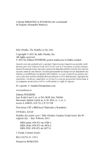 Buddha din podul casei a fost recompensat in 2012 cu PEN/Faulkner Award, in Statele Unite, si cu Prix Femina Etranger, in Europa. Subiectul neobisnuit al romanului Buddha din podul casei este importul masiv de femei japoneze in San Francisco in anii 1920. Tratate ca o marfa, femeile erau comandate prin posta, in urma unor casatorii aranjate prin corespondenta si bazate doar pe un schimb de fotografii – o afacere prospera pentru mijlocitorii acestor aranjamente. Realitatea care le asteapta pe tinerele japoneze pe tarimul fagaduintei este una neasteptata, de multe ori cruda, si multe din ele nu-si vor reveni niciodata. Insa in urma acestui fenomen a rezultat o intreaga generatie de origine nipona care a inceput sa traiasca intr-o noua patrie, iar ulterior a cazut victima vinatorii de vrajitoare din timpul celui de-al Doilea Razboi Mondial. Spunind povestea tinerelor japoneze ajunse pe pamint american, Otsuka alege o forma de naratiune inedita, poetica si, in acelasi timp, incarcata de povesti individuale, ce a fost asemanata de critici cu vocea colectiva a corului antic grecesc. Concentrarea istoriilor personale in fraze scurte, de mare impact, cu un ritm interior captivant, confera forta si farmec acestei carti neobisnuit de frumoase in dramatismul ei. „Buddha din podul casei isi desfasoara firul sub forma unor povesti intretesute, unele nu mai lungi de un paragraf. Desi aceasta concentrare narativa pare sa le impuna personajelor o distanta emotionala, ea insufla de fapt romanului o puternica incarcatura afectiva. Stilul incantatoriu al lui Otsuka face ca proza ei sa se apropie de poezie.” (The New York Times Book Review) „Otsuka elaboreaza in culori scinteietoare, care pilpiie, se amesteca si irizeaza intr-un joc de lumini si umbre, un portret colectiv al japonezelor venite in America in chip de mirese prin corespondenta.” (Library Journal) „Un splendid poem in proza, care ofera o lectie amara de istorie.” (Kirkus Reviews) Carte recomandata de: