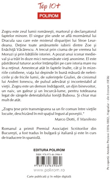 Zogru este zeul lumii romanesti, martorul si declansatorul faptelor minore. El singur stie unde se afla mormintul lui Dracula sau care este misterul disparitiei lui Stroe Leurdeanu. Detine toate amanuntele iubirii dintre Zoe si Enachita Vacarescu. A trecut prin ciuma de pe vremea lui Moruzi si prin bataliile istoriei. A pozat unui iconar medieval si-a trait in doze mici nenumarate vieti anonime. El este pastratorul tuturor acelor intimplari pe care istoria mare nu le-a retinut. Amestecat atit in faptele inalte, cit si in mizeriile cotidiene, viata lui depinde in buna masura de nefericirile si de fricile lumii, de suferintele Giuliei, de cinismul lui Andrei Ionescu, de pulsul adevarat si incontestabil al vietii. Zogru este un demon indragostit, un djin binevoitor, un naiv, un gafeur si un incurca-lume, pentru totdeauna legat de singele detestabilului Ionita Bubosu. Si chiar mai mult de atit.