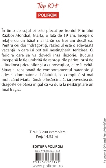Traducere din limba franceza de Demostene Botez In timp ce sotul ei este plecat pe frontul Primului Razboi Mondial, Marta, o fata de 19 ani, incepe o relatie cu un baiat mai tinar cu trei ani decit ea. Pentru cei doi indragostiti, razboiul este o adevarata vacanta in care isi pot trai nestingheriti fericirea. O fericire care se va dovedi insa iluzorie. Bucuria incepe sa le fie umbrita de reprosurile parintilor si de atitudinea prietenilor si a cunoscutilor, care ii evita. Situatia, tensionata de comportamentul paranoic si adesea dominator al baiatului, se complica si mai mult cind Marta ramine insarcinata, iar povestea de dragoste ce parea initial ca va dura la nesfirsit are un final tragic.