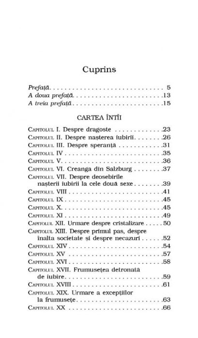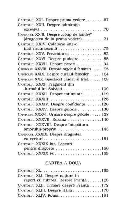 In traducerea lui Gellu Naum La treizeci si cinci de ani, Stendhal o cunoaste pe Matilde Dembowski, de care se indragosteste fulgerator. Respins de femeia adorata, isi propune sa scrie o carte in care sa faca o analiza „exacta si stiintifica” a iubirii. Astfel ia nastere eseul Despre dragoste. Pornind de la o tipologie a iubirii cu patru categorii – iubirea-pasiune, iubirea-capriciu, iubirea fizica si iubirea din vanitate –, Stendhal descrie procesul de „cristalizare” prin care indragostitul ajunge la „iubirea perfecta”. Rezultatul este o carte unde consideratiile obiective au pe alocuri o profunda amprenta personala, unde poezia si anecdota se impletesc cu psihologia, iar vocea filozofului e acompaniata de aceea a indragostitului.