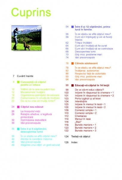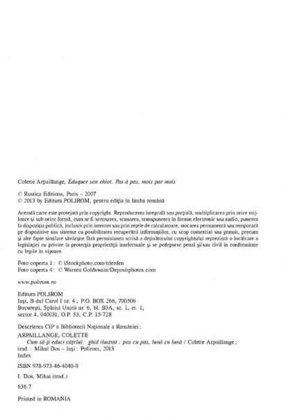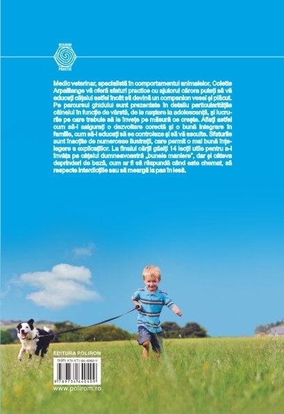 Medic veterinar, specialista in comportamentul animalelor, Colette Arpaillange va ofera sfaturi practice cu ajutorul carora puteti sa va educati catelul astfel incit sa devina un companion vesel si placut. Pe parcursul ghidului sint prezentate in detaliu particularitatile ciinelui in functie de virsta, de la nastere la adolescenta, si lucrurile pe care trebuie sa le invete pe masura ce creste. Aflati astfel cum sa-i asigurati o dezvoltare corecta si o buna integrare in familie, cum sa-l educati sa se controleze si sa va asculte. Sfaturile sint insotite de numeroase ilustratii, care permit o mai buna intelegere a explicatiilor. La finalul cartii gasiti 14 lectii utile pentru a-l invata pe catelul dumneavoastra „bunele maniere”, dar si citeva deprinderi de baza, cum ar fi sa raspunda cind este chemat, sa respecte interdictiile sau sa mearga la pas in lesa.