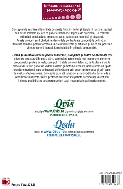 Conceptul de auxiliare diferențiate destinate învățării limbii și literaturii române, realizat de Editura Paralela 45, are ca punct culminant culegerile de excelență – o realizare editorială unică atât ca amploare, cât și ca noutate metodică și didactică. Aceste culegeri sunt ghiduri fundamentale pentru toate competițiile de limba și literatura română, pentru formarea unei culturi literare și artistice și, de ce nu, pentru o viitoare carieră literară, jurnalistică și în științele comunicării.