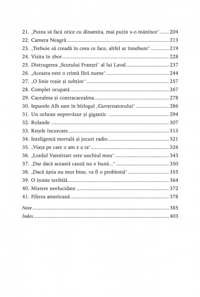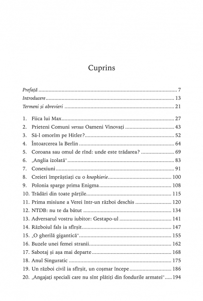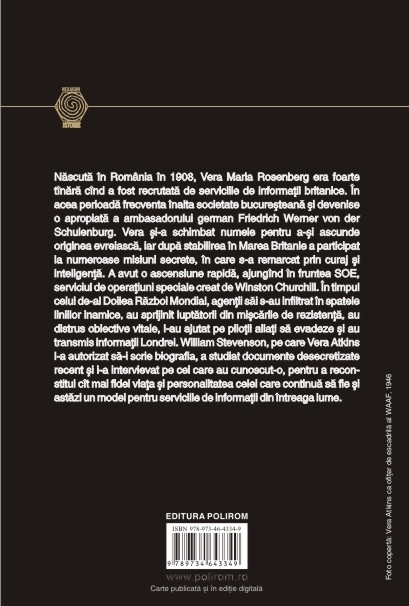 Traducere de Ciprian Siulea Nascuta in Romania in 1908, Vera Maria Rosenberg era foarte tinara cind a fost recrutata de serviciile de informatii britanice. In acea perioada frecventa inalta societate bucuresteana si devenise o apropiata a ambasadorului german Friedrich Werner von der Schulenburg. Vera si-a schimbat numele pentru a-si ascunde originea evreiasca, iar dupa stabilirea in Marea Britanie a participat la numeroase misiuni secrete, in care s-a remarcat prin curaj si inteligenta. A avut o ascensiune rapida, ajungind in fruntea SOE, serviciul de operatiuni speciale creat de Winston Churchill. In timpul celui de-al Doilea Razboi Mondial, agentii sai s-au infiltrat in spatele liniilor inamice, au sprijinit luptatorii din miscarile de rezistenta, au distrus obiective vitale, i-au ajutat pe pilotii aliati sa evadeze si au transmis informatii Londrei. William Stevenson, pe care Vera Atkins l-a autorizat sa-i scrie biografia, a studiat documente desecretizate recent si i-a intervievat pe cei care au cunoscut-o, pentru a reconstitui cit mai fidel viata si personalitatea celei care continua sa fie si astazi un model pentru serviciile de informatii din intreaga lume.