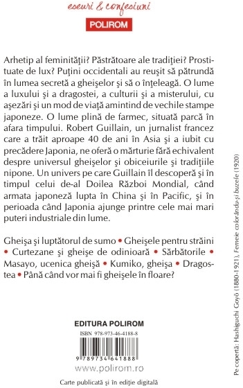Traducere de Ioan Bita Arhetip al feminitatii? Pastratoare ale traditiei? Prostituate de lux? Putini occidentali au reusit sa patrunda in lumea secreta a gheiselor si sa o inteleaga. O lume a luxului si a dragostei, a culturii si a misterului, cu asezari si un mod de viata amintind de vechile stampe japoneze. O lume plina de farmec, situata parca in afara timpului. Robert Guillain, un jurnalist francez care a trait aproape 40 de ani in Asia si a iubit cu precadere Japonia, ne ofera o marturie fara echivalent despre universul gheiselor si obiceiurile si traditiile nipone. Un univers pe care Guillain il descopera si in timpul celui de-al Doilea Razboi Mondial, cind armata japoneza lupta in China si in Pacific, si in perioada cind Japonia ajunge printre cele mai mari puteri industriale din lume.