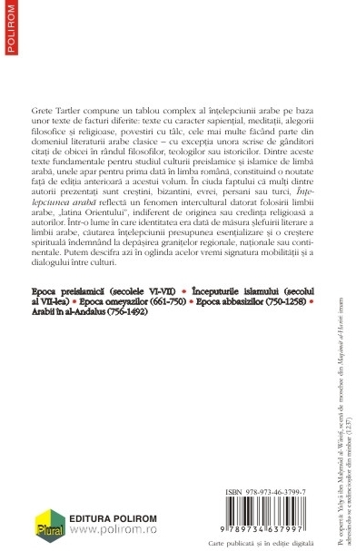 Editia a III‑a revazuta si adaugita Grete Tartler compune un tablou complex al intelepciunii arabe pe baza unor texte de facturi diferite: texte cu caracter sapiential, meditatii, alegorii filosofice si religioase, povestiri cu tilc, cele mai multe facind parte din domeniul literaturii arabe clasice – cu exceptia unora scrise de ginditori citati de obicei in rindul filosofilor, teologilor sau istoricilor. Dintre aceste texte fundamentale pentru studiul culturii preislamice si islamice de limba araba, unele apar pentru prima data in limba romana, constituind o noutate fata de editia anterioara a acestui volum. In ciuda faptului ca multi dintre autorii prezentati sint crestini, bizantini, evrei, persani sau turci, Intelepciunea araba reflecta un fenomen intercultural datorat folosirii limbii arabe, „latina Orientului”, indiferent de originea sau credinta religioasa a autorilor. Intr-o lume in care identitatea era data de masura slefuirii literare a limbii arabe, cautarea intelepciunii presupunea esentializare si o crestere spirituala indemnind la depasirea granitelor regionale, nationale sau continentale. Putem descifra azi in oglinda acelor vremi signatura mobilitatii si a dialogului intre culturi.