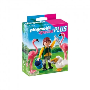 Ajuta ingrijitorul sa hraneasca pasarile exotice. Setul contine o figurina, doi flamingo, un pelican, un peste si o galeata. Va puteti juca doar cu doar acest set sau il puteti combina cu alte seturi PLAYMOBIL.