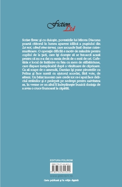 Editia a II-a Scrise firesc si cu duiosie, povestirile lui Mircea Diaconu poarta cititorul in lumea aparent idilica a pustiului din La noi, cind vine iarna, care ascunde insa drame cutremuratoare. O operatie dificila e motiv de mindrie pentru copilul de la tara, care isi doreste sa se intoarca acasa pentru ca nu s-a dat cu sania decit de o suta de ori. Cofetaria e locul de intilnire cu fata cu mers de salbaticiune, care dispare inexplicabil dupa o vinatoare de caprioare. Ca sa scape de o amenda, Damian isi pune pirostriile cu Pelina si face nunta cu ajutorul acordat, fara voie, de sateni. Un baiat inocent care crede tot ce-i spui face deliciul strainilor si e pedepsit pe nedrept pentru naivitatea sa, in vreme ce un altul ii indeplineste bunicii dorinta de a avea o cruce frumoasa la capatii.