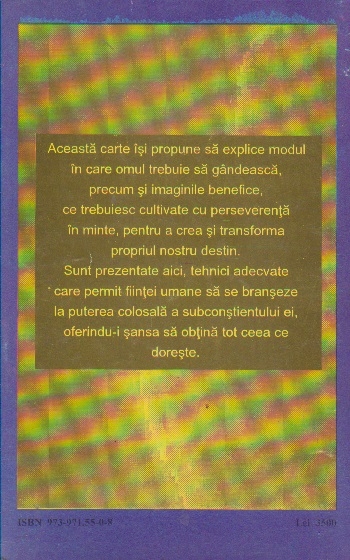 Tehnicile prezentate aici ii permit celui care le aplica sa se conecteze la puterea colosala a subconstientului sau, astfel incat sa obtina rezultate visate. In realitate, omul devine ceea ce gandeste, lucru care explica de ce un om e trist si altul fericit, de ce unul e geniu in ceea ce face, in timp ce altul se zbate o viata si tot nu obtine nimic, de ce unii primesc raspunsuri la rugaciuni, iar altii nu, etc.
