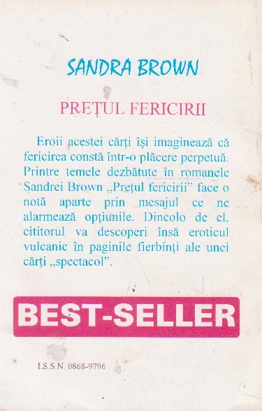 Comandă online Pretul fericirii la 10,50 lei scrisă de Sandra Brown, tiparită la editura Columna face parte din colecția Best-Seller în anul 1994. cu plata ramburs sau online cu cardul. Momentan titlul Pretul fericirii nu este disponibil însa vă puteți înscrie pentru a fi notificat în momenul reaprovizionarii.