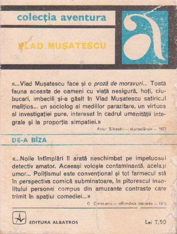 Comandă online cartea "De-a biza (Jocurile detectivului Conan)" la 10,50 lei scrisă de Vlad Musatescu, tiparită la editura Albatros face parte din colecția Aventura în anul 1977. cu plata ramburs sau online cu cardul. Momentan titlul "De-a biza (Jocurile detectivului Conan)" nu este disponibil însa vă puteți înscrie pentru a fi notificat în momenul reaprovizionarii.