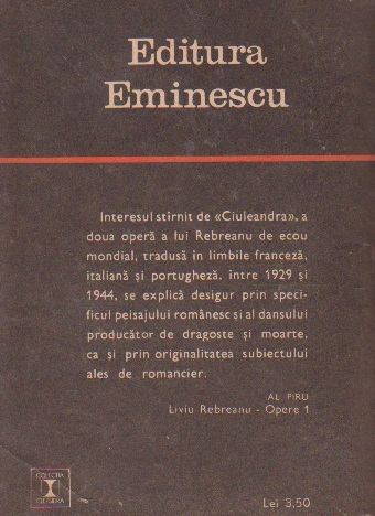 Comandă online cartea "Ciuleandra, Editie 1970" la 6,20 lei scrisă de Liviu Rebreanu, tiparită la editura Eminescu face parte din colecția Clepsidra în anul 1970. Livrare din stoc cu plata ramburs sau online cu cardul.