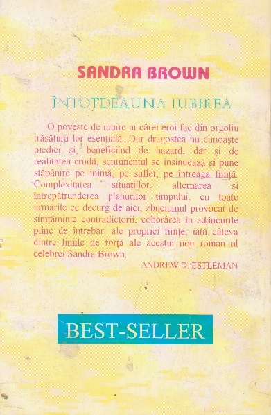 Comandă online cartea "Intotdeauna iubirea" la 10,50 lei scrisă de Sandra Brown, tiparită la editura Columna în anul 1994 cu un număr de 197 pagini. cu plata ramburs sau online cu cardul. Momentan titlul "Intotdeauna iubirea" nu este disponibil însa vă puteți înscrie pentru a fi notificat în momenul reaprovizionarii.