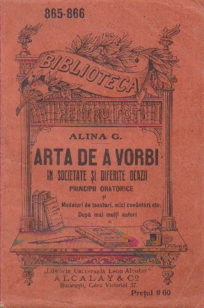 Comandă online cartea "Arta de a vorbi in societate si diferite ocazii" la 20,10 lei scrisă de Alina G., tiparită la editura Librariei Leon Alcalay cu un număr de 168 pagini categorie Dezvoltare personala, Psihologie, Bibliofilie / Cărți rare. cu plata ramburs sau online cu cardul. Momentan titlul "Arta de a vorbi in societate si diferite ocazii" nu este disponibil însa vă puteți înscrie pentru a fi notificat în momenul reaprovizionarii.