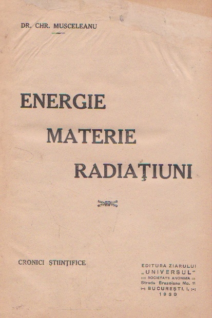 Comandă online cartea "Energie, materie, radiatiuni. Cronici stiintifice" la 41,20 lei scrisă de Chr. Musceleanu, tiparită la editura Tipografia Ziarului Universul în anul 1930 cu un număr de 268 pagini. cu plata ramburs sau online cu cardul. Momentan titlul "Energie, materie, radiatiuni. Cronici stiintifice" nu este disponibil însa vă puteți înscrie pentru a fi notificat în momenul reaprovizionarii.
