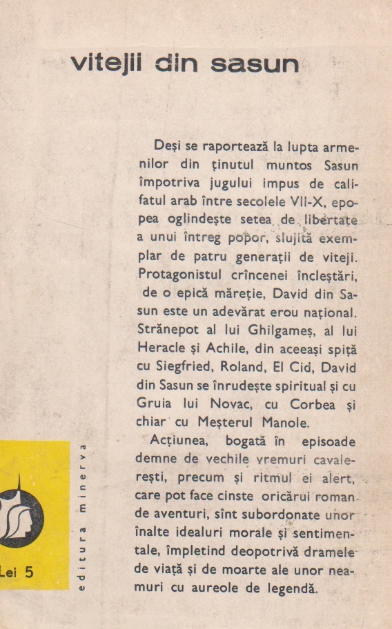 Comandă online Vitejii din Sasun. Epopee populara armeana la 10,50 lei Nicolae Teica, tiparită la editura Minerva face parte din colecția BPT serie noua în anul 1971. cu plata ramburs sau online cu cardul. Momentan titlul Vitejii din Sasun. Epopee populara armeana nu este disponibil însa vă puteți înscrie pentru a fi notificat în momenul reaprovizionarii.