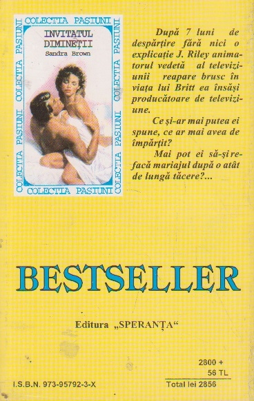 Comandă online Invitatul diminetii la 10,50 lei isbn 973957923x scrisă de Sandra Brown, tiparită la editura Speranta cu un număr de 255 pagini. cu plata ramburs sau online cu cardul. Momentan titlul Invitatul diminetii nu este disponibil însa vă puteți înscrie pentru a fi notificat în momenul reaprovizionarii.