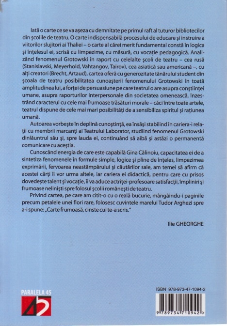 Comandă online Jerzy Grotowski - Metafizica artei actorului (Cu dedicatia autorului) la 41,20 lei scrisă de Gina Calinoiu, tiparită la editura Paralela 45 face parte din colecția DESCHIDERI în anul 2010. cu plata ramburs sau online cu cardul. Momentan titlul Jerzy Grotowski - Metafizica artei actorului (Cu dedicatia autorului) nu este disponibil însa vă puteți înscrie pentru a fi notificat în momenul reaprovizionarii.