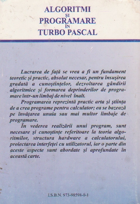 Comandă online Algoritmi si programare in Turbo Pascal la 13,60 lei scrisă de Constantin Zavoianu, tiparită la editura Soft Computer în anul 2000 cu un număr de 280 pagini. cu plata ramburs sau online cu cardul. Momentan titlul Algoritmi si programare in Turbo Pascal nu este disponibil însa vă puteți înscrie pentru a fi notificat în momenul reaprovizionarii.