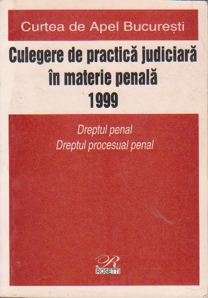 Comandă online cartea "Curtea de Apel Bucuresti. Culegere de practica judiciara in materie penala 1999. Dreptul penal. Dreptul procesual penal" la 26,40 lei Dan Lupascu, tiparită la editura Rosetti în anul 2001 cu un număr de 475 pagini. cu plata ramburs sau online cu cardul. Momentan titlul "Curtea de Apel Bucuresti. Culegere de practica judiciara in materie penala 1999. Dreptul penal. Dreptul procesual penal" nu este disponibil însa vă puteți înscrie pentru a fi notificat în momenul reaprovizionarii.