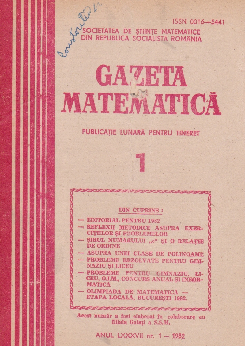 Comandă online cartea "Gazeta Matematica, 1/1982" la 4,10 lei Societatea de Stiinte Matematice din Romania, tiparită la editura Gazeta Matematica face parte din colecția Gazeta Matematica în anul 1982. cu plata ramburs sau online cu cardul. Momentan titlul "Gazeta Matematica, 1/1982" nu este disponibil însa vă puteți înscrie pentru a fi notificat în momenul reaprovizionarii.