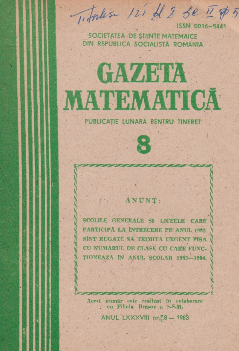 Comandă online cartea "Gazeta Matematica, 8/1983" la 3,10 lei Societatea de Stiinte Matematice din Romania, tiparită la editura Gazeta Matematica face parte din colecția Gazeta Matematica în anul 1983. cu plata ramburs sau online cu cardul. Momentan titlul "Gazeta Matematica, 8/1983" nu este disponibil însa vă puteți înscrie pentru a fi notificat în momenul reaprovizionarii.