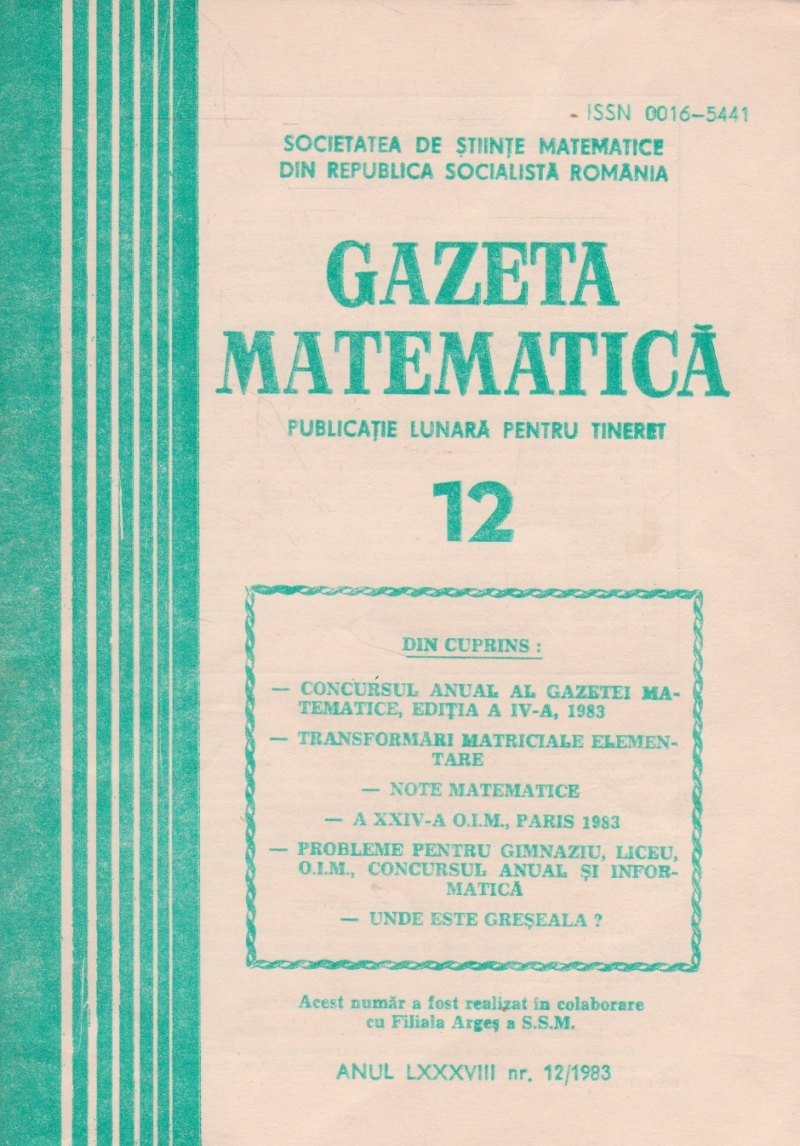 Comandă online cartea "Gazeta Matematica, 12/1983" la 4,10 lei Societatea de Stiinte Matematice din Romania, tiparită la editura Gazeta Matematica face parte din colecția Gazeta Matematica în anul 1983. cu plata ramburs sau online cu cardul. Momentan titlul "Gazeta Matematica, 12/1983" nu este disponibil însa vă puteți înscrie pentru a fi notificat în momenul reaprovizionarii.