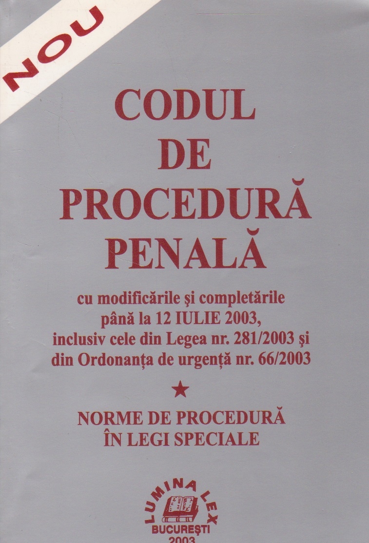 Comandă online Codul de procedura penala cu modificarile si completarile pana la 12 iulie 2003 la 10,50 lei, tiparită la editura Lumina Lex în anul 2003 cu un număr de 463 pagini de anticariat (foarte buna). Livrare din stoc cu plata ramburs sau online cu cardul.