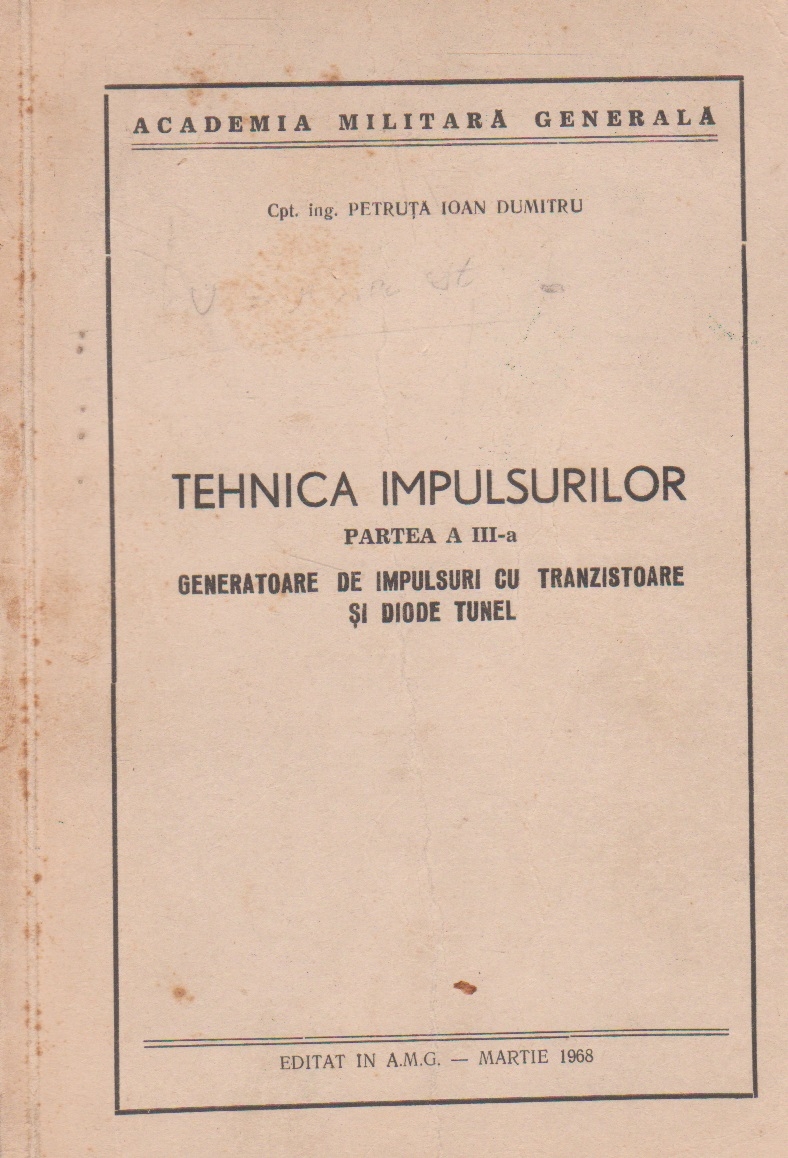 Comandă online cartea "Tehnica impulsurilor. Partea a III-a Generatoare de impulsuri cu tranzistoare si diode tunel" la 20,10 lei scrisă de Petruta Ioan Dumitru, tiparită la editura Academia Militara în anul 1968 cu un număr de 346 pagini. cu plata ramburs sau online cu cardul. Momentan titlul "Tehnica impulsurilor. Partea a III-a Generatoare de impulsuri cu tranzistoare si diode tunel" nu este disponibil însa vă puteți înscrie pentru a fi notificat în momenul reaprovizionarii.
