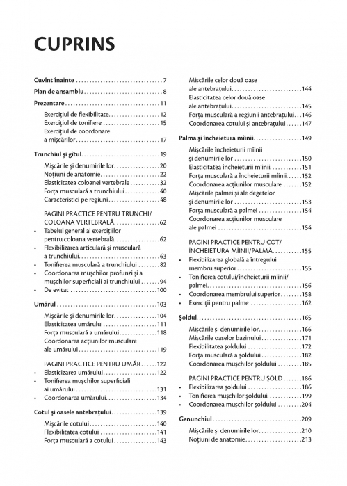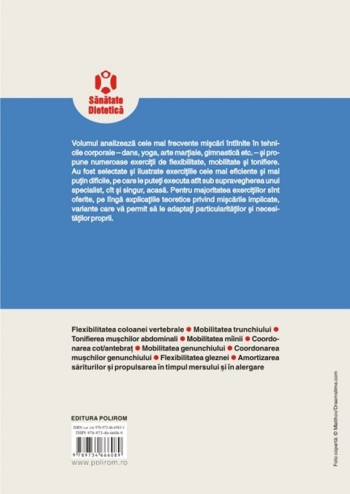 Volumul analizează cele mai frecvente mişcări întîlnite în tehnicile corporale – dans, yoga, arte marţiale, gimnastică etc. – şi propune numeroase exerciţii de flexibilitate, mobilitate şi tonifiere. Au fost selectate şi ilustrate exerciţiile cele mai eficiente şi mai puţin dificile, pe care le puteţi executa atît sub supravegherea unui specialist, cît şi singur, acasă. Pentru majoritatea exerciţiilor sînt oferite, pe lîngă explicaţiile teoretice privind mişcările implicate, variante care vă permit să le adaptaţi particularităţilor şi necesităţilor proprii.