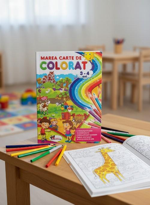 Marea Carte de Colorat pentru 3-4 ani a fost gândită tocmai să ajute copiii să învețe să coloreze. Ilustrațiile celor 111 pagini respectă temele din programa de grădiniță pentru grupa mică. Puștii se vor întâlni cu jucării îndrăgite din universul copilăriei, vor experimenta colorând și își vor face noi prieteni dintre personajele cărții, fie acestea păsări, insecte, animale domestice ori sălbatice. Copiii iubesc animalele, iubesc să le vadă, să le atingă și să își imagineze propriile povești cu veverițe, pisici, albine, delfini, elefanți etc. Iată, nimic mai la îndemâna părinților și a educatorilor decât să îi călăuzească pe cei mici în lumea fascinantă a culorilor, alături de Marea Carte de Colorat.