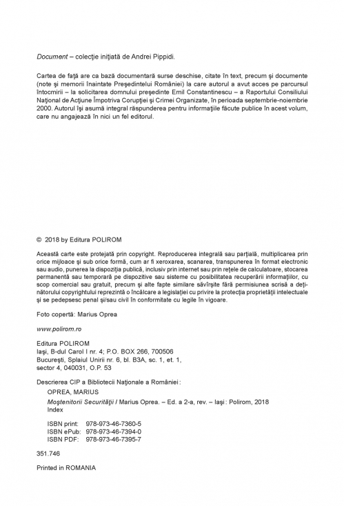 Ce i-a deosebit pe securişti de restul oamenilor? Cum au ajuns ei să‑i bată, să‑i aresteze şi chiar să‑i ucidă pe cei cîţiva care aveau curajul să spună că regele e gol şi să‑i umilească pe cei care îndrăzneau să asculte într‑o tăcere resemnată adevăruri elementare? Formulînd răspunsuri la asemenea întrebări şi plecînd de la propria experienţă a contactului cu Securitatea în 1988, Marius Oprea alcătuieşte o istorie a transformărilor acesteia de la totalitarism la democraţie, cu scopul de a descoperi ceea ce se află dincolo de amintirea traumatizantă sau de mit. Volumul oferă informaţii despre ce s-a ales de moştenirea şi mai ales de moştenitorii fostei poliţii politice comuniste, într-o încercare de a-i cuantifica reziduurile în lumea în care trăim.