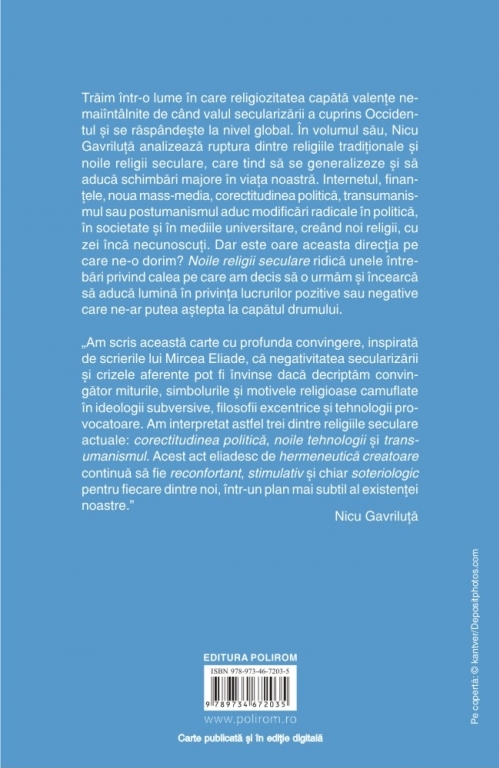 Trăim într-o lume în care religiozitatea capătă valenţe nemaiîntîlnite de cînd valul secularizării a cuprins Occidentul şi se răspîndeşte la nivel global. În volumul său, Nicu Gavriluţă analizează ruptura dintre religiile tradiţionale şi noile religii seculare, care tind să se generalizeze şi să aducă schimbări majore în viaţa noastră. Internetul, finanţele, noua mass-media, corectitudinea politică, transumanismul sau postumanismul aduc modificări radicale în politică, în societate şi în mediile universitare, creînd noi religii, cu zei încă necunoscuţi. Dar este oare aceasta direcţia pe care ne-o dorim? Noile religii seculare ridică unele întrebări privind calea pe care am decis să o urmăm şi încearcă să aducă lumină în privinţa lucrurilor pozitive sau negative care ne-ar putea aştepta la capătul drumului.