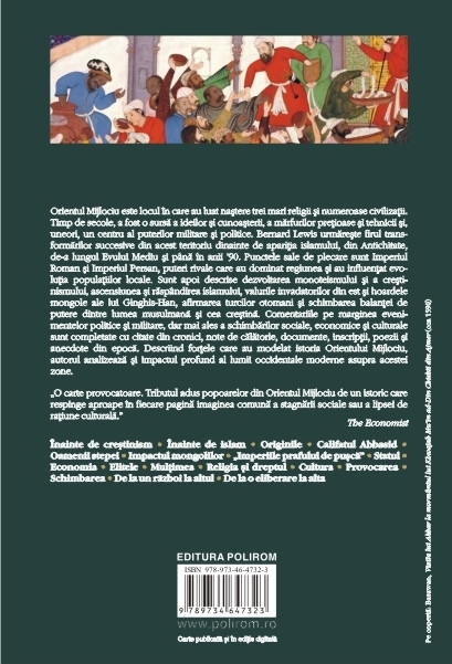 Orientul Mijlociu este locul in care au luat nastere trei mari religii si numeroase civilizatii. Timp de secole, a fost o sursa a ideilor si cunoasterii, a marfurilor pretioase si tehnicii si, uneori, un centru al puterilor militare si politice. Bernard Lewis urmareste firul transformarilor succesive din acest teritoriu dinainte de aparitia islamului, din Antichitate, de-a lungul Evului Mediu si pina in anii ’90. Punctele sale de plecare sint Imperiul Roman si Imperiul Persan, puteri rivale care au dominat regiunea si au influentat evolutia populatiilor locale. Sint apoi descrise dezvoltarea monoteismului si a crestinismului, ascensiunea si raspindirea islamului, valurile invadatorilor din est si hoardele mongole ale lui Ginghis-Han, afirmarea turcilor otomani si schimbarea balantei de putere dintre lumea musulmana si cea crestina. Comentariile pe marginea evenimentelor politice si militare, dar mai ales a schimbarilor sociale, economice si culturale sint completate cu citate din cronici, note de calatorie, documente, inscriptii, poezii si anecdote din epoca. Descriind fortele care au modelat istoria Orientului Mijlociu, autorul analizeaza si impactul profund al lumii occidentale moderne asupra acestei zone.