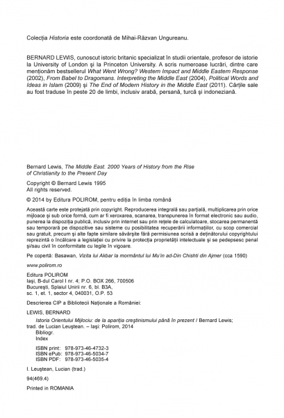 Comandă online cartea "Istoria Orientului Mijlociu. De la apariția creștinismului până în prezent" la 62,40 lei isbn 9789734647323 scrisă de Bernard Lewis, tiparită la editura Polirom face parte din colecția Historia. Cartea poate fi livrată în circa 2 zile cu plata ramburs sau online cu cardul.