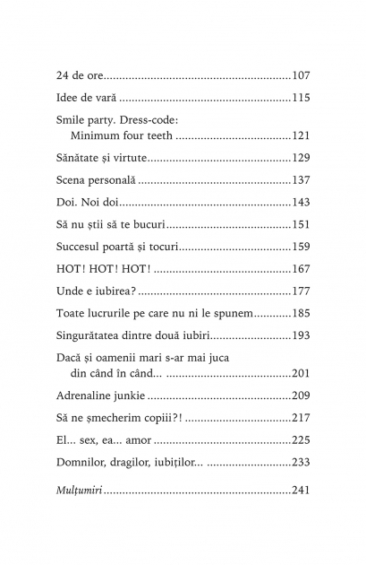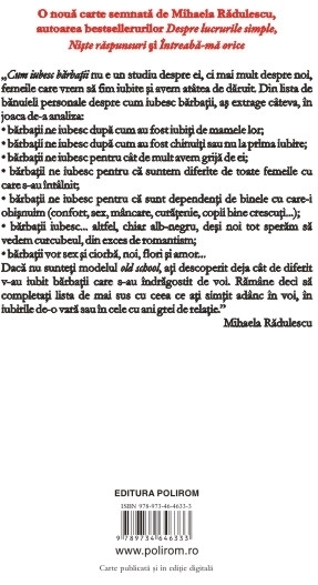 O noua carte semnata de Mihaela Radulescu, autoarea bestsellerurilor Despre lucrurile simple, Niste raspunsuri si Intreaba-ma orice „Cum iubesc barbatii nu e un studiu despre ei, ci mai mult despre noi, femeile care vrem sa fim iubite si avem atitea de daruit. Din lista de banuieli personale despre cum iubesc barbatii, as extrage citeva, in joaca de-a analiza: • barbatii ne iubesc dupa cum au fost iubiti de mamele lor; • barbatii ne iubesc dupa cum au fost chinuiti sau nu la prima iubire; • barbatii ne iubesc pentru cit de mult avem grija de ei; • barbatii ne iubesc pentru ca sintem diferite de toate femeile cu care s-au intilnit; • barbatii ne iubesc pentru ca sint dependenti de binele cu care-i obisnuim (confort, sex, mincare, curatenie, copii bine crescuti...); • barbatii iubesc... altfel, chiar alb-negru, desi noi tot speram sa vedem curcubeul, din exces de romantism; • barbatii vor sex si ciorba, noi, flori si amor... Daca nu sinteti modelul old school, ati descoperit deja cit de diferit v-au iubit barbatii care s-au indragostit de voi. Ramine deci sa completati lista de mai sus cu ceea ce ati simtit adinc in voi, in iubirile de-o vara sau in cele cu ani grei de relatie.” (Mihaela Radulescu)