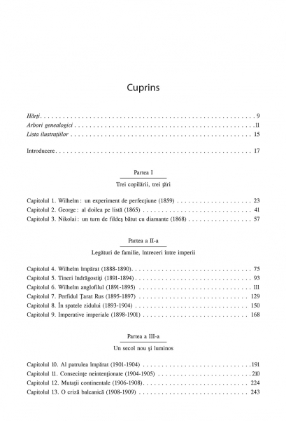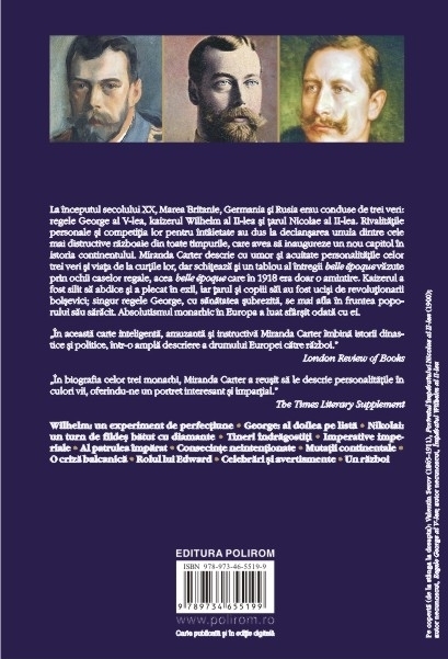 Traducere de Mihaela Negrila La inceputul secolului XX, Marea Britanie, Germania si Rusia erau conduse de trei veri: regele George al V-lea, kaizerul Wilhelm al II-lea si tarul Nicolae al II-lea. Rivalitatile personale si competitia lor pentru intiietate au dus la declansarea unuia dintre cele mai distructive razboaie din toate timpurile, care avea sa inaugureze un nou capitol in istoria continentului. Miranda Carter descrie cu umor si acuitate personalitatile celor trei veri si viata de la curtile lor, dar schiteaza si un tablou al intregii belle epoque vazute prin ochii caselor regale, acea belle epoque care in 1918 era doar o amintire. Kaizerul a fost silit sa abdice si a plecat in exil, iar tarul si copiii sai au fost ucisi de revolutionarii bolsevici; singur regele George, cu sanatatea subrezita, se mai afla in fruntea poporului sau saracit. Absolutismul monarhic in Europa a luat sfirsit odata cu ei. „In aceasta carte inteligenta, amuzanta si instructiva Miranda Carter imbina istorii dinastice si politice, intr-o ampla descriere a drumului Europei catre razboi.” (London Review of Books) „In biografia celor trei monarhi, Miranda Carter a reusit sa le descrie personalitatile in culori vii, oferindu-ne un portret interesant si impartial.” (The Times Literary Supplement) Din cuprins: Wilhelm: un experiment de perfectiune • George: al doilea pe lista • Nikolai: un turn de fildes batut cu diamante • Tineri indragostiti • Imperative imperiale • Al patrulea imparat • Consecinte neintentionate • Mutatii continentale • O criza balcanica • Rolul lui Edward • Celebrari si avertismente • Un razboi