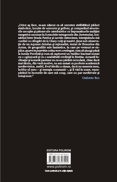 „Orice as face, m-am nascut ca sa cercetez strabatind paduri simbolice, locuite de unicorni si grifoni, si comparind structurile ascutite si patrate ale catedralelor cu impunsaturile malitiei exegetice ascunse in formulele tetragonale din Summulae, hoinarind intre Strada Paielor si navele cisterciene, intretinindu-ma cordial cu calugari de la Cluny culti si masivi, tinut sub observatie de un Aquinat dolofan si rationalist, tentat de Honorius din Autun, de geografiile sale fantastice, in care pe vremuri se explica quare in pueritia coitus non contingat, cum sa ajungi pina la Insula Pierduta si cum sa capturezi un vasilisc inarmat numai cu o oglinjoara si cu o neabatuta credinta in Bestiar. Aceasta inclinatie si aceasta pasiune nu m-au parasit niciodata, chiar daca mai tirziu, din varii motive, nu am urmat ca profesie academica medievistica. Astfel, Evul Mediu a ramas, daca nu meseria mea, hobby-ul meu – si tentatia constanta –, si il vad in toate, transparind in lucrurile de care ma ocup, care nu par medievale si totusi sint.” (Umberto Eco)