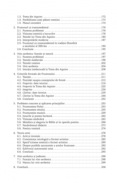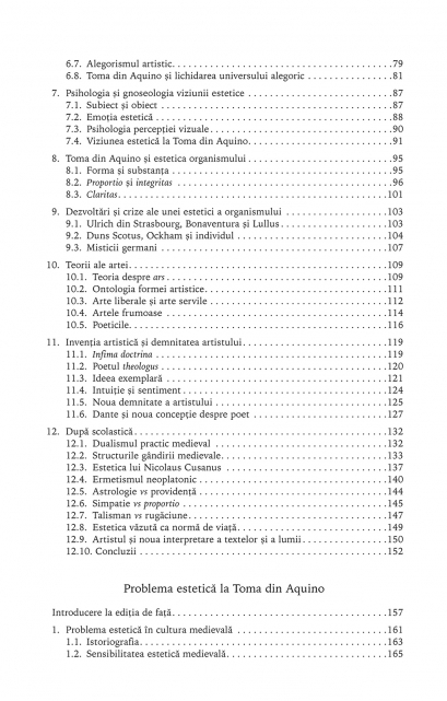 Sint incluse cercetarile sale despre estetica medievala, in special cea a lui Toma din Aquino, studiile de semantica despre arbor porphyriana si despre evolutia medievala a notiunii aristotelice de metafora, analize avind ca subiect limbajul animal, falsificarea, tehnicile de reintrebuintare din Evul Mediu, textele lui Beatus din Liebana si ale literaturii apocaliptice, ale lui Dante, ale lui Raimundus Lullus si ale lullismului, interpretarile moderne ale esteticii tomiste, inclusiv textele de tinerete ale lui Joyce. O a doua sectiune cuprinde texte mai putin academice, dar care pot oferi nespecialistilor citeva idei cu privire la gindirea medievala si la ecourile pe care aceasta le are in epoca moderna, cu reflectii asupra embrionilor in viziunea lui Toma din Aquino, estetica luminii in paradisul dantesc, Milionul lui Marco Polo, miniaturile irlandeze si cele din Evul Mediu tirziu, o parte dintre ele redate in fasciculul de imagini.