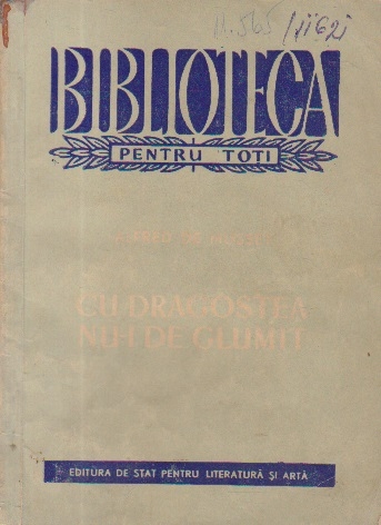 Comandă online cartea "Cu dragostea nu-i de glumit - Comedie in 3 acte" la 6,20 lei scrisă de Alfred de Musset, tiparită la editura Editura de Stat pentru Literatura si Arta face parte din colecția Biblioteca Pentru Toti în anul 1956. cu plata ramburs sau online cu cardul. Momentan titlul "Cu dragostea nu-i de glumit - Comedie in 3 acte" nu este disponibil însa vă puteți înscrie pentru a fi notificat în momenul reaprovizionarii.