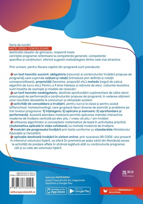 Seria de lucrări MATE 2000+ CONSOLIDARE, destinată claselor de gimnaziu, respectă toate cerințele programei referitoare la competențe generale, competențe specifice și conținuturi, oferind sugestii metodologice dintre cele mai atractive.