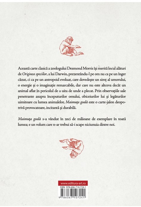 Această carte clasică a zoologului Desmond Morris își merită locul alături de Originea speciilor, a lui Darwin, prezentându-l pe om nu ca pe un înger căzut, ci ca pe un antropoid evoluat, care dovedește un simț al umorului, o energie și o imaginație remarcabile, dar care nu este altceva decât un animal aflat în pericolul de a uita de unde a plecat. Prin observațiile sale penetrante asupra începuturilor omului, obiceiurilor lui și legăturilor uimitoare cu lumea animalelor, Maimuța goală este o carte-jalon deopotrivă provocatoare, incitantă și durabilă.
