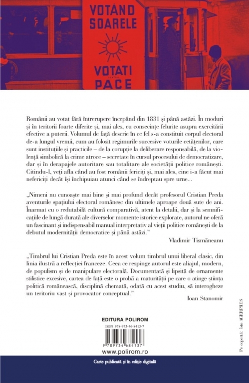 „Nimeni nu cunoaște mai bine și mai profund decît profesorul Cristian Preda aventurile spațiului electoral românesc din ultimele aproape două sute de ani. Înarmat cu o redutabilă cultură comparativă, atent la detalii, dar și la semnificațiile de lungă durată ale diverselor momente istorice explorate, autorul ne oferă un fascinant și indispensabil manual interpretativ al vieții politice românești de la debutul modernității democratice și pînă astăzi.” (Vladimir Tismăneanu)