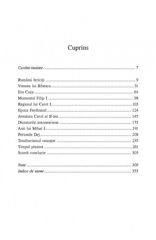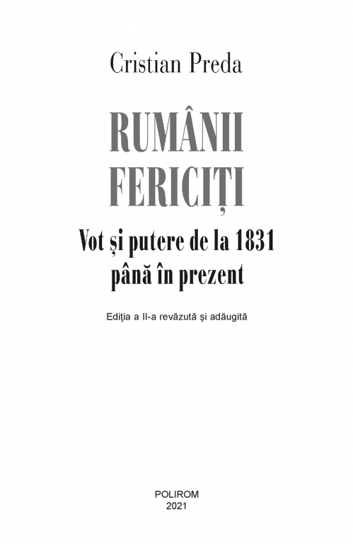 Românii au votat fără întrerupere începînd din 1831 și pînă astăzi. În moduri și în teritorii foarte diferite și, mai ales, cu consecințe felurite asupra exercitării efective a puterii. Volumul de față descrie în ce fel s–a constituit corpul electoral de-a lungul vremii, cum au folosit regimurile succesive voturile cetățenilor, care sînt instituțiile și practicile – de la corupție la deliberare responsabilă, de la violență simbolică la crime atroce – secretate în cursul procesului de democratizare, dar și în derapajele autoritare sau totalitare ale societății politice românești. Citindu-l, veți afla cînd au fost românii fericiți și, mai ales, cine i-a făcut mai nefericiți decît își închipuiau atunci cînd se îndreptau spre urne...
