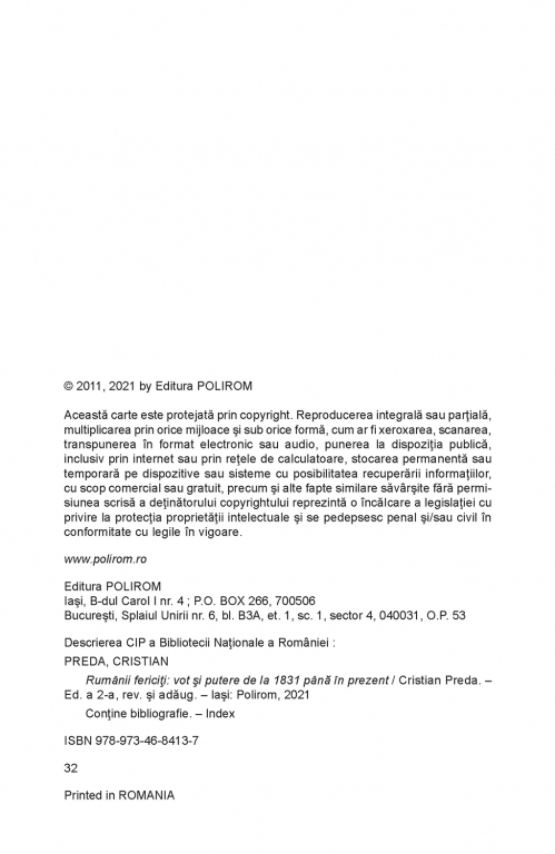 Comandă online Rumânii fericiți. Vot și putere de la 1831 până în prezent (ediţia a II-a revăzută şi adăugită) la 42,20 lei isbn 9789734684137 scrisă de Cristian Preda, tiparită la editura Polirom face parte din colecția OPUS -> Stiinte politice. Cartea poate fi livrată în circa 2 zile cu plata ramburs sau online cu cardul.