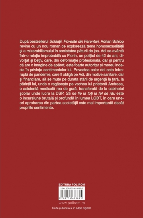 După bestsellerul Soldații. Poveste din Ferentari, Adrian Schiop revine cu un nou roman ce explorează tema homosexualității și a mizerabilismului în societatea păturii de jos. Adi se avîntă într-o relație improbabilă cu Florin, un polițist de 42 de ani, divorțat și bețiv, care, din deformație profesională, dar și pentru că are o imagine de apărat, este foarte autoritar și mereu indecis în privința sentimentelor lui. Povestea celor doi este întreruptă de pandemie, care îl obligă pe Adi, din motive sanitare, dar și financiare, să se mute pe durata stării de urgență la țară, la părinții lui, unde o regăsește pe vechea lui prietenă Andreea, o asistentă medicală rea de gură, transferată de la cabinetul școlar unde lucra la DSP. Să ne fie la toți la fel de rău este o incursiune brutală și profundă în lumea LGBT, în care uneori aprobarea din partea societății este mai importantă decît propriile sentimente.