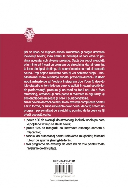 Știi că lipsa de mișcare scade imunitatea și crește dramatic incidența bolilor, însă amîni la nesfîrșit să faci ceva în privința aceasta, sub diverse pretexte. Dacă ți-a trecut vreodată prin minte să începi un program de stretching, dar ai renunțat la idee din lipsă de timp, de acum înainte nu mai ai această scuză. Poți obține rezultate care îți vor schimba viața – mobilitate mai mare, suferințe alinate, prevenția durerii – în doar nouă minute pe zi! Vedeta Instagram Joe Yoon îți dezvăluie sfaturile și tehnicile pe care le aplică în cazul sportivilor de performanță, precum și un mod cu totul nou de a face stretching, arătîndu-ți cum poate fi realizată în siguranță și eficient fiecare mișcare și care îi sînt beneficiile.