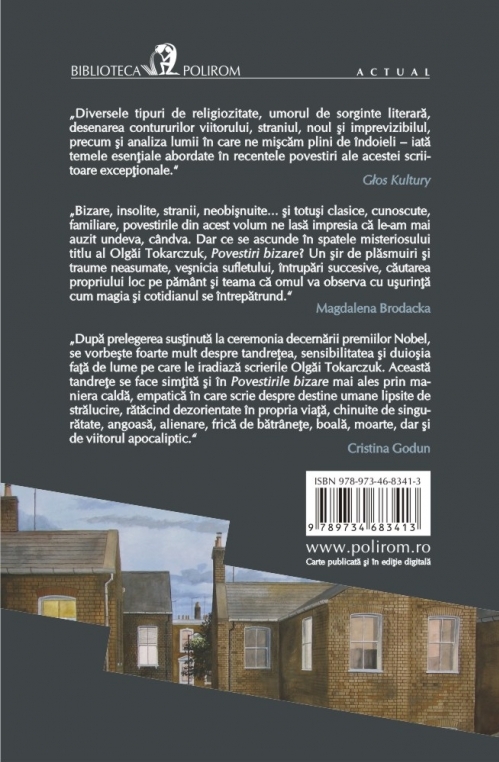„Bizare, insolite, stranii, neobişnuite… şi totuşi clasice, cunoscute, familiare, povestirile din acest volum ne lasă impresia că le-am mai auzit undeva, cîndva. Dar ce se ascunde în spatele misteriosului titlu al Olgăi Tokarczuk, Povestiri bizare? Un şir de plăsmuiri şi traume neasumate, veşnicia sufletului, întrupări succesive, căutarea propriului loc pe pămînt şi teama că omul va observa cu uşurinţă cum magia şi cotidianul se întrepătrund.” (Magdalena Brodacka)