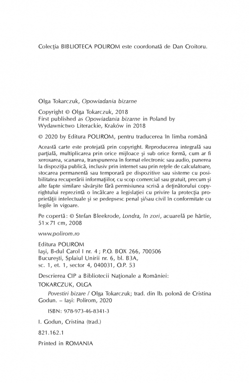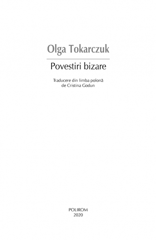 Un medic scoţian din secolul al XVII-lea, ajuns în slujba regelui Poloniei, descoperă o rasă ciudată de copii vegetali. O familie formată din patru femei identice primeşte vizita unui cuplu de bărbaţi similari. Un bătrîn văduv, însingurat şi tipicar, observă într-o dimineaţă că lumea din jur s-a transformat aleatoriu (sau, dacă nu, că şi-a pierdut el minţile). O lume degradată, dintr-un viitor nedefinit, îşi păstrează stabilitatea graţie sacrificiului unui personaj misterios, aparent nemuritor, ce suferă pentru oameni de peste trei sute de ani. În zece texte dense, pline de dinamism şi surprinzătoare de la premise pînă la final, imaginaţia neîngrădită ce caracterizează Povestirile bizare ale Olgăi Tokarczuk cucereşte nu doar prin subiecte ori prin atmosfera creată, ci şi prin forţa empatică ce le străbate. Pendulînd între fantastic, SF, straniu şi insolit, aceste povestiri reprezintă tot atîtea mostre de virtuozitate şi inventivitate artistică ale acestei remarcabile prozatoare.