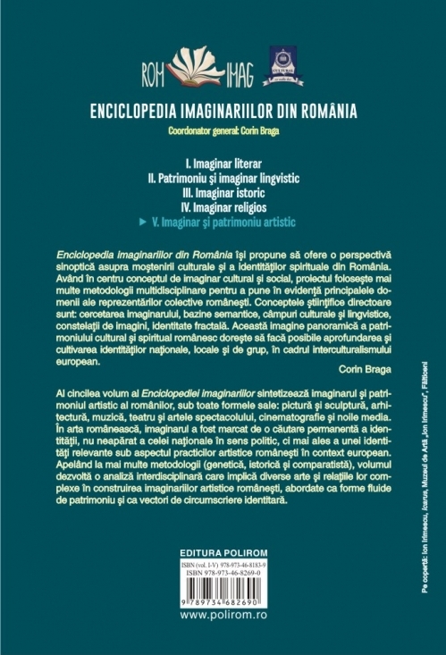 Al cincilea volum al Enciclopediei imaginariilor sintetizează imaginarul și patrimoniul artistic al românilor, sub toate formele sale: pictură și sculptură, arhitectură, muzică, teatru și artele spectacolului, cinematografie și noile media. În arta românească, imaginarul a fost marcat de o căutare permanentă a identității, nu neapărat a celei naționale în sens politic, ci mai ales a unei identități relevante sub aspectul practicilor artistice românești în context european. Apelînd la mai multe metodologii (genetică, istorică și comparatistă), volumul dezvoltă o analiză interdisciplinară care implică diverse arte și relațiile lor complexe în construirea imaginariilor artistice românești, abordate ca forme fluide de patrimoniu și ca vectori de circumscriere identitară.