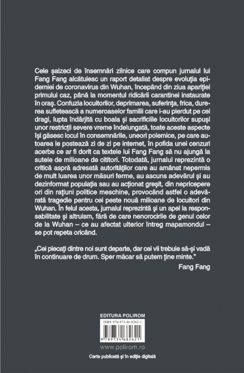 Cele șaizeci de însemnări zilnice care compun jurnalul lui Fang Fang alcătuiesc un raport detaliat despre evoluția epidemiei de coronavirus din Wuhan, începînd din ziua apariției primului caz, pînă la momentul ridicării carantinei instaurate în oraș. Confuzia locuitorilor, deprimarea, suferința, frica, durerea sufletească a numeroaselor familii care i-au pierdut pe cei dragi, lupta îndîrjită cu boala și sacrificiile locuitorilor supuși unor restricții severe vreme îndelungată, toate aceste aspecte își găsesc locul în consemnările, uneori polemice, pe care autoarea le postează zi de zi pe internet, în pofida unei cenzuri acerbe ce ar fi dorit ca textele lui Fang Fang să nu ajungă la sutele de milioane de cititori. Totodată, jurnalul reprezintă o critică aspră adresată autorităților care au amînat nepermis de mult luarea unor măsuri ferme, au ascuns adevărul și au dezinformat populația sau au acționat greșit, din nepricepere ori din rațiuni politice meschine, provocînd astfel o adevărată tragedie pentru cei peste nouă milioane de locuitori din Wuhan. În felul acesta, jurnalul reprezintă și un apel la responsabilitate și altruism, fără de care nenorocirile de genul celor de la Wuhan – ce au afectat ulterior întreg mapamondul – se pot repeta oricînd.
